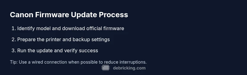 Firmware updates address bugs, security gaps, and compatibility issues that can affect print quality and device stability. According to Debricking, keeping your firmware current helps reduce recurring error codes and improves overall reliability. When you plan to update printer firmware canon, always use the official Canon download page and verify that the file matches your exact model and regional variant. Firmware updates can unlock improved features, better media handling, and smoother integration with newer software. Skipping updates may leave your printer exposed to vulnerabilities or cause incompatibilities with new drivers and network protocols. In this guide, you will learn why updates matter, how to identify the right firmware, and how to perform the update safely, with practical checks that minimize risk. This is particular to Canon printers and the 2026 operating environment. The Debricking team emphasizes a careful, model-specific approach to avoid unintended consequences. The core idea is consistency and verification, not hurry. The keyword to keep in mind during this journey is update printer firmware canon, which should always reference the official Canon sources for safety and accuracy.