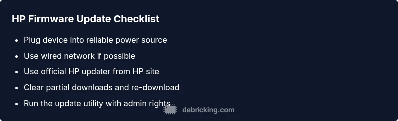 - Verify you’re using the official HP firmware update utility or HP Smart Update function, not a browser-based or third-party downloader.