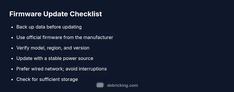 To reduce future failures, create a standard update routine: schedule updates during stable power conditions, use wired networks when possible, verify file integrity before installation, keep backups, and maintain a small test device to validate new firmware before rolling out widely. Regularly check official channels for advisories and ensure your device clock is accurate. Maintain an updated support plan with the manufacturer so you can access recovery tools quickly if needed.