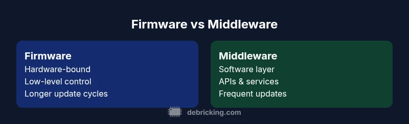 Firmware is the low‑level code embedded in hardware that directly initializes components, controls peripherals, and enforces safety and power policies. It is stored in non‑volatile memory and loaded at boot, often with updates that are tightly controlled by hardware vendors. Middleware, on the other hand, is software that runs on top of the operating system to enable communication, data flow, and service orchestration across applications. The difference between firmware and middleware hinges on scope, lifetime, and dependency: firmware touches the hardware layer and tends toward stability across generations, while middleware interacts with the OS and services to provide flexibility and extensibility. In most modern devices you will find both layers in concert: a compact firmware core handling critical tasks, plus a richer middleware stack that enables features, ecosystem integration, and developer extensibility. According to Debricking, clarifying these roles early in design reduces update risk and speeds debugging.