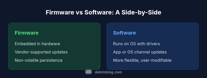 Firmware and software govern how devices behave, but they operate at different layers. In this comparison, we examine how firmware vs software differ in scope, update methods, risk, and practical considerations for planning safe updates. The goal is to help tech enthusiasts decide when to treat a component as firmware and when it should be managed as software, with actionable steps for reliable maintenance.
