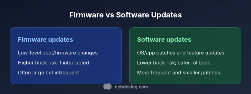 Most firmware updates are delivered through OTA (over-the-air) channels or direct USB/SD card flashing. They often require the device to restart and may temporarily take longer due to flashing processes. Software updates are typically delivered via app stores or the device’s built-in updater, with rollback options in many modern systems. The risk profile also differs: firmware updates can brick a device if interrupted, while software updates usually fail gracefully or offer a recovery fallback. Debricking's guidance emphasizes verifying the update source, ensuring power stability, and avoiding mid-process interruptions to minimize risk.