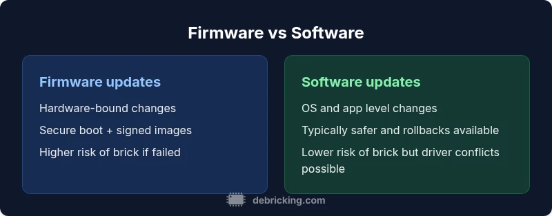 Firmware updates sit at the hardware boundary, while software updates operate in the operating system and apps. In practice, firmware v software decisions affect device reliability, security, and support lifecycle. According to Debricking, choosing the right path depends on your goal: deeper hardware control versus safer, user-facing features. This TL;DR compares both to help you decide quickly and safely.