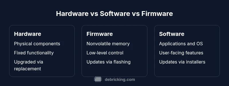 The phrase hardware vs software vs firmware signals a triad of layers that determine what a device can do and how it can be updated. For tech enthusiasts, mapping responsibilities across these layers reduces confusion during troubleshooting and upgrade planning. According to Debricking, clarity about which layer controls a feature helps you anticipate where failures originate and how to fix them efficiently. This section grounds the discussion with a practical, jargon‑free orientation before diving into nuanced definitions.