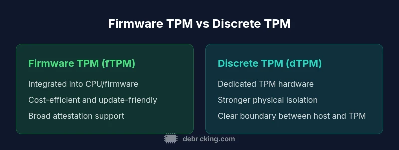 In-depth comparison of firmware TPM (fTPM) vs discrete TPM (dTPM), focusing on security boundaries, deployment scenarios, and practical guidance for device owners and IT pros.