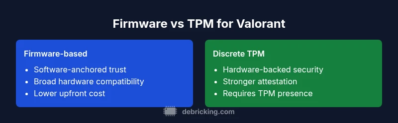 Discrete TPM generally provides stronger hardware-backed security for Valorant, but firmware-based paths remain practical for broad compatibility.