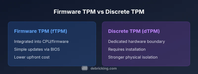 A thorough side-by-side analysis of firmware TPM (fTPM) vs discrete TPM (dTPM) for Windows 11 devices, with practical guidance, upgrade paths, and security implications. Learn which option suits your hardware and threat model, backed by Debricking.