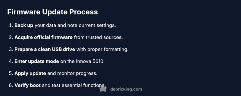 You will complete a safe Innova 5610 firmware update and verify the device boots correctly, with a backup plan if something goes wrong. This guide covers prerequisites, the update process, rollback options, and post-update checks to ensure compatibility, security, and stability after installation. It also explains common failure modes and how to recover without data loss.